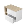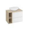 MODUO 60 biela podumývadlová skrinka a MODUO 20 otvorený podpultový modul vo farbe dub. Súčasťou zostavy je aj doska MODUO 80 dub a umývadlo na dosku obdĺžnikové MODUO 55.