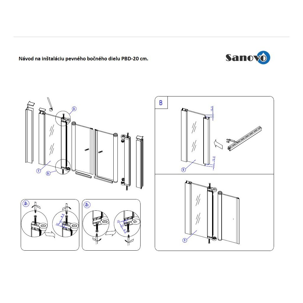 Dvojkrídlové sprchové dvere s dvomi fixnými dielmi na oboch stranách sprchových dverí sú elegantné a veľmi priestranné. Dĺžka fixného dielu sprchových dverí je 20 cm. Bočný diel je vyrobený s kvalitného AL rámu v ktorom je vsadené tvrdené bezpečnostné sklo o hrúbke 6mm. Sprchové dvere sú bezbariérové a vyznačujú sa širokým vstupom do sprchovacieho priestoru. Povrch tvrdeného skla je upravený špeciálnou vrstvou Easy Clean, ktorá je antibakteriálna, odolná proti usadzovaniu vodného kameňa.