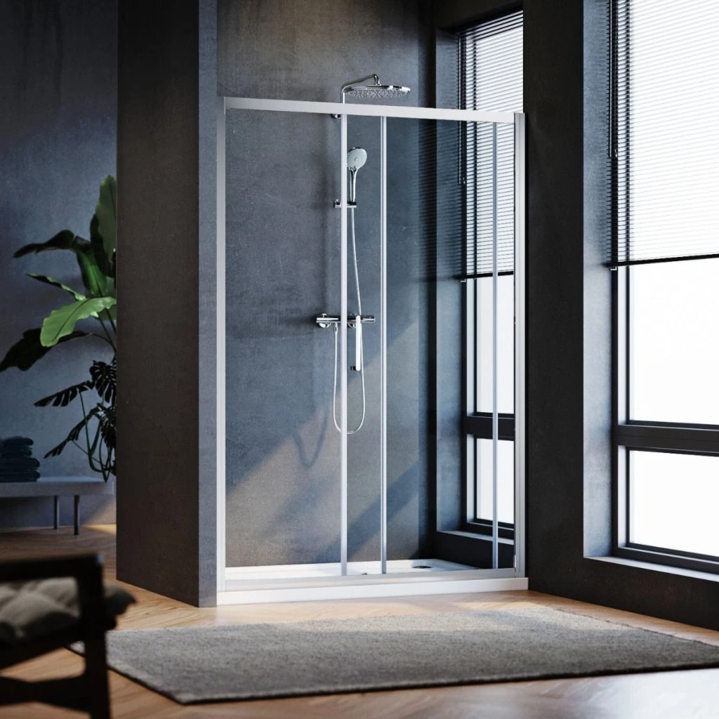 Posuvné sprchové dvere sa skladajú s robustné rám s tvrdeným bezpečnostným sklom.