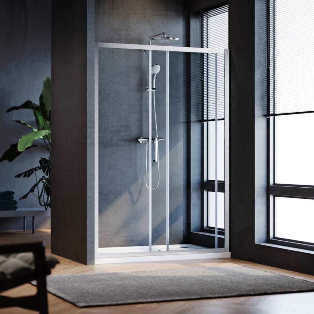 Posuvné sprchové dvere sa skladajú s robustné rám s tvrdeným bezpečnostným sklom.